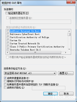 9)进入“受保护的EAP属性”设置页面,不勾选“通过验证证书来验证服务器的身份”,其他为默认,点击下方“配置”;