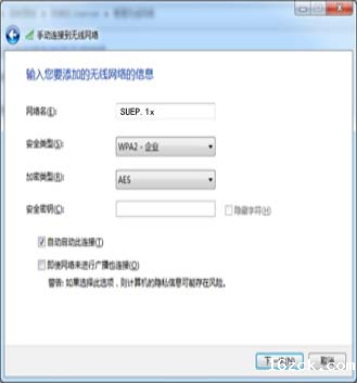 6)网络名输入“suep.1x”,安全类型选择“WPA2-企业”,加密类型选择“AES”,安全密钥不填,点击“下一步”;